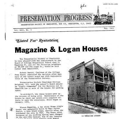 File contains Preservation Progress article (May, 1977); house history from Information for Guides of Historic Charleston.
