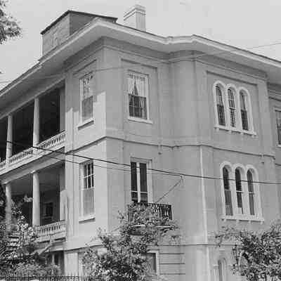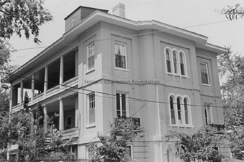 Two B&W photographs of 11 Meeting Street, corner view showing the east (front) and south (piazzas) elevations at different orientations.Collection