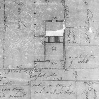 Constructed 1780s. This house served as a carriage house for a now-vanished 18th century dwelling to the east. Though rehabilitated in the 1920s, the building retained the arched entry, which is infilled by a window with Neoclassical moldings and the hipped roof and upper fenestration.