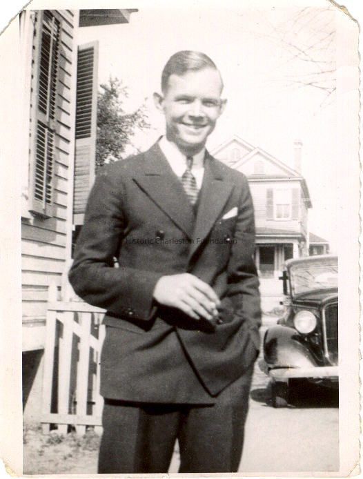 Scan of B&W photograph of a young man standing in the driveway of his home at 11 Sutherland. A car is also in the driveway. The house at 12 Sutherland Avenue is in the background.Collection