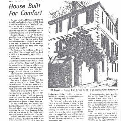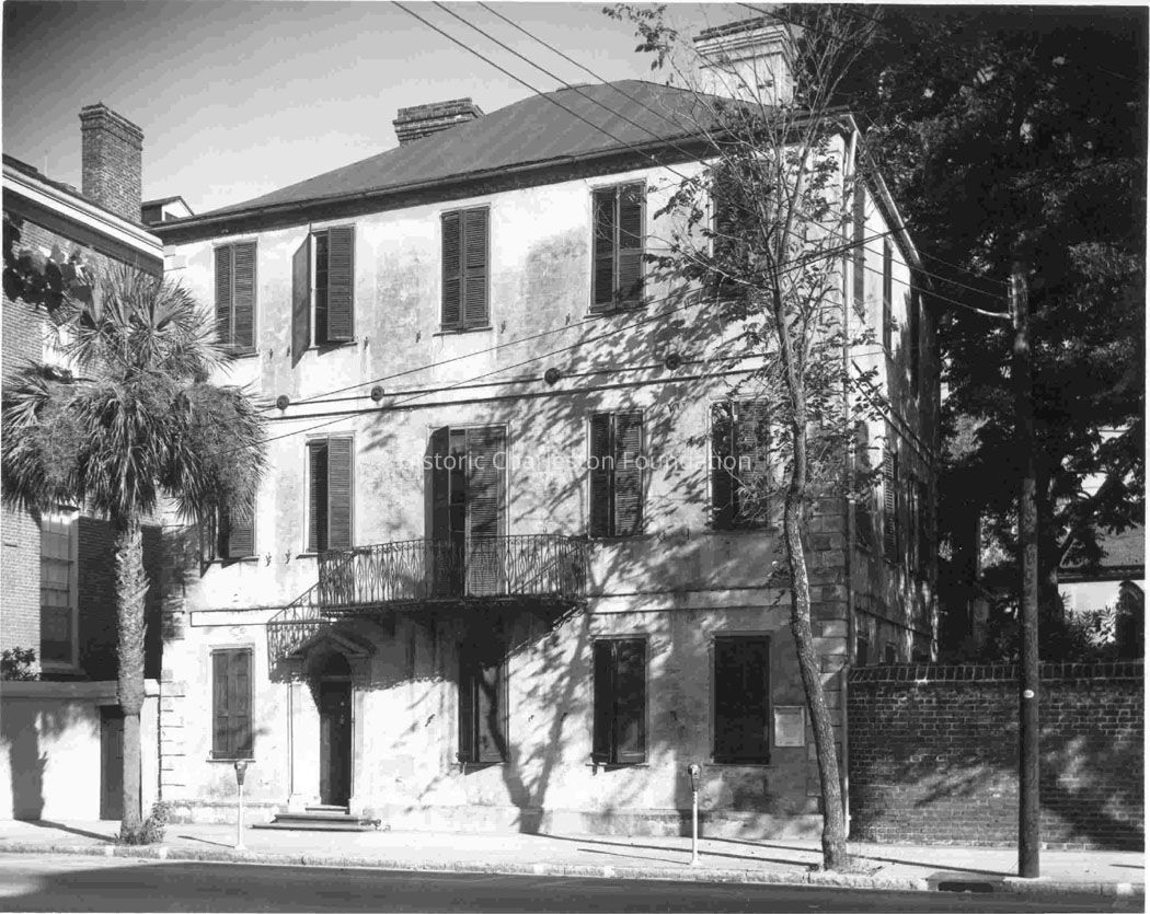 Constructed ca. 1728; altered ca. 1800, 1837; renovated 1981, 1985. Escaping the great fires of the 18th and 19th centuries, 110 Broad Street stands as an example of a relatively intact pre-Revolutionary structure. The merchant's house plan follows that of 92 Broad Street and other large dwellings of the pre-1740 period with a front office entry and a chambered rear stair hall ascending to a second story dominated by a large front drawing room and smaller withdrawing room. The house is composed of thick masonry walls accentuated by corner quoins and rises three stories to a bellcast hipped roof, pierced by large chimneys with corbeled caps. The Harveys, the builders, leased this substantial dwelling to royal governor James Glen from 1743 to 1756. Notable exterior changes were made about 1800, including the Neoclassical fanlighted front door with delicate gougework surround and second story wrought-iron balcony. The yard includes a variety of former dependencies, including a Gothic style carriage house on a garden lot subdivided by the second owners, the Izards, from the Lining property in 1796, a privy and kitchen building with original cooking fireplace, bake oven, and warming oven. Ralph Stead Izard sold the house in 1837 to his aunt Mary and her husband, Ambassador Joel Poinsett, famous for bringing the poinsettia back from Mexico. The Poinsetts lived here and added several imported Italian marble mantels to the interior before selling to Judge Mitchell King.