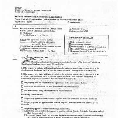 Three files contain documentation of the easement on the property (exterior provisions) including related correspondence and Confirmation of Understanding; Part I certification (National Register); annual inspection reports; requests for alterations; correspondence related to the management of the property; FOHG house history (1982); newspaper article (DYKYC, 1978); excerpt from 60 Famous Houses; house history from Architectural Guide to Charleston; photocopies of plat and Sanborn maps; Symphony Designer House program (1981); copies of interior and exterior photos (2003); excerpt from Charleston Doorways, ca. 1928, including photos and architectural drawings.