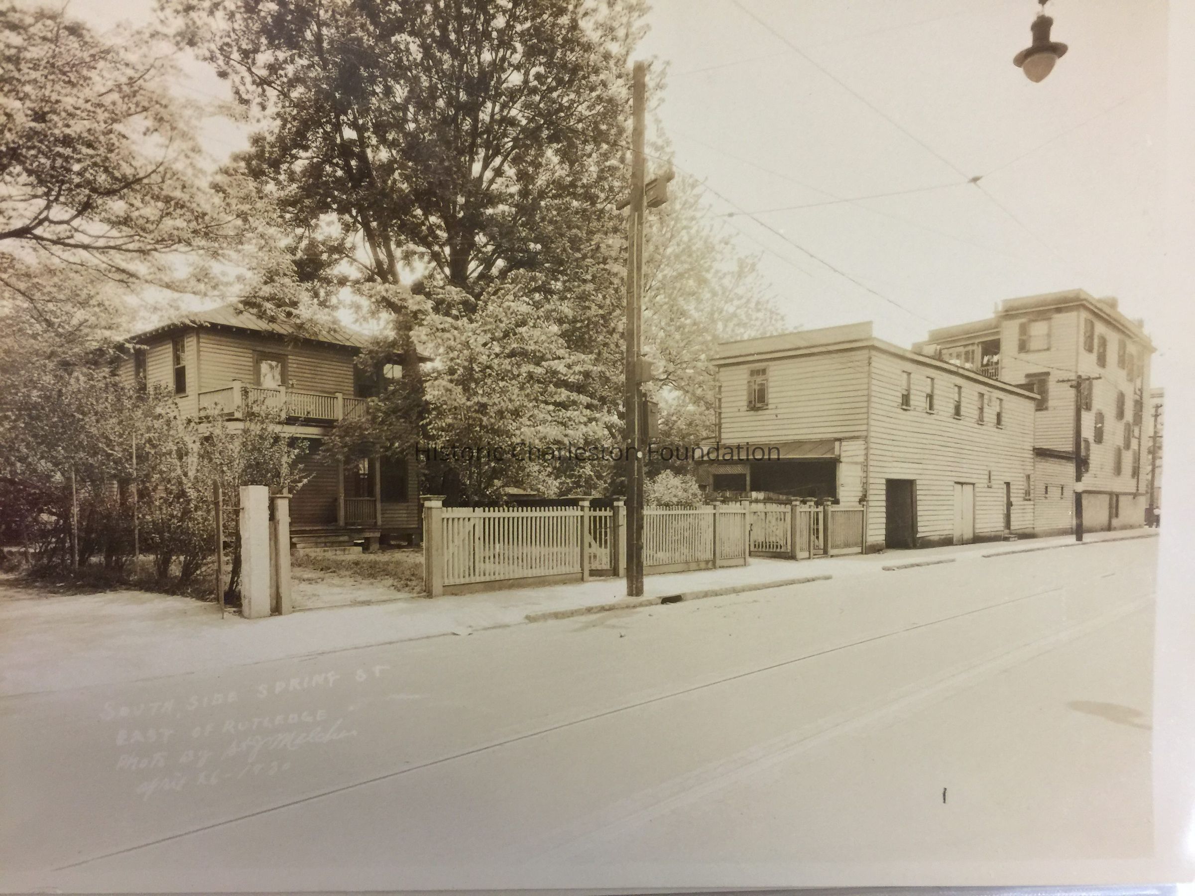 B&W photograph (scan) of 111 Spring Street, 115 Spring Street, and 222 Rutledge Avenue (Spring St. elevation) (L to R). Photo is captioned: "South side of Spring St. east of Rutledge. Photo by St. J. Melcher, April 26, 1930."