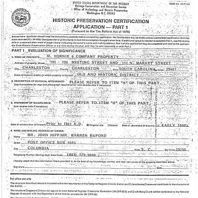 Constructed 1850-52; rehabilitated 1982-83, 1995. This substantial 4-story building with a granite columnar storefront and matching lintels, sills, and projecting cornice was built soon after the acquisition of this key site in the beginning of the 1850s. Serving a succession of clothing and dry goods stores, it continued this use with the Hornik family, who leased the property in 1892 from the owners, the Claussens, and eventually purchased the parcel after 1917. The small building to the east lost much of its facade in the mid-20th century but regained its earlier detailing in a massive historic rehabilitation of the structures in 1982-83. (Poston, Buildings of Charleston.)