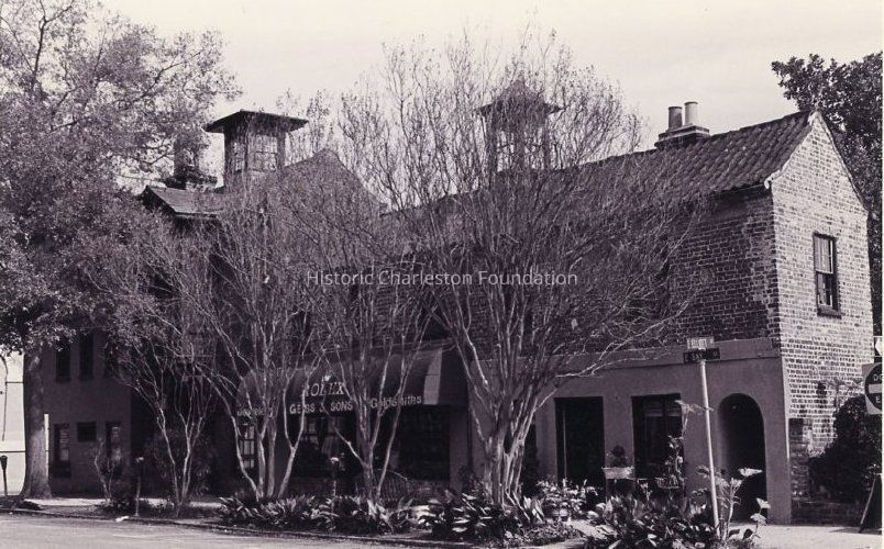 B&W photograph of Coates' Row (114-120 East Bay Street), front (west) elevation, showing the southwest corner of 114 East Bay and the street corner (East Bay and Elliott Streets). Geiss & Sons jewelry store at center.Collection