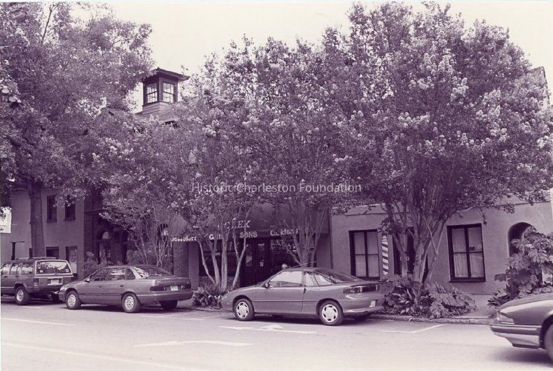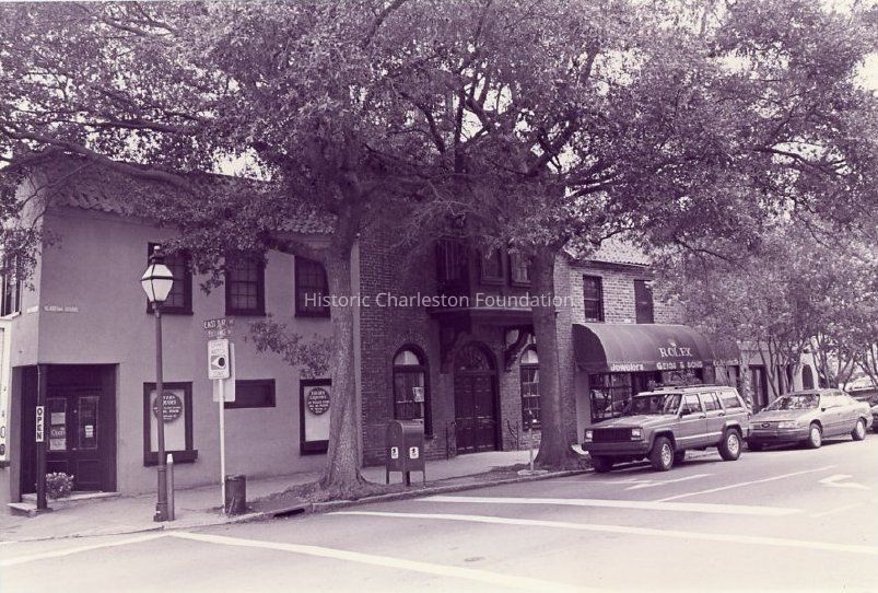 Two B&W photographs of Coates' Row (114-120 East Bay Street), front (west) elevation, showing the Tavern Liquor Store (120 East Bay), 118 East Bay, Geiss & Sons Jewelry (16 East Bay), and Still's Barber Shop (114 East Bay) (left to right).Collection