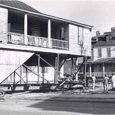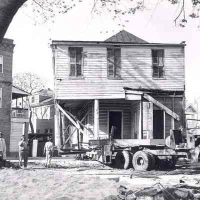 Four B&W photographs showing originally located at 114 Anson Street being moved to 61 Laurens Street.