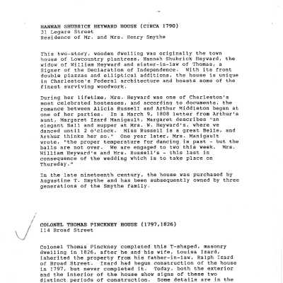 File contains HCF Federal Architecture Tour house history (1994); SC Historical Society tour house history (1972); narrative history (Poston?); narrative history (Mary Alma Parker); house history from Information for Guides of Historic Charleston (1984); building history from Architectural Guide to Charleston (by Simons & Thomas); Preservation Progress article about plaque award (May 1968); photocopy of plat of house and dependencies (1829); photocopy of excerpt from Charleston Then and Now (Rhett & Steele); correspondence about Diocese's restoration plans (1990).Collection