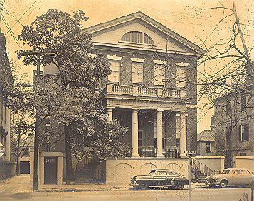 B&W photograph of 114 Broad Street (Col. Thomas Pinckney House). Two cars parked on street in front. Likely by Louis Schwartz.Collection