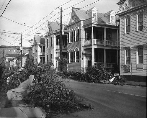 B&W photograph of 119-129 Wentworth Street after Hurricane Hugo. 127 Wentworth is most prominently featured. Debris in foreground.Collection