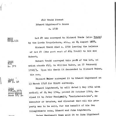 Constructed 1748-50; rebuilt 1789-96. A wealthy merchant partner of Gabriel Manigault and co-owner of the ship Neptune built a substantial brick house on this lot after acquiring it from the Baker family of Archdale Hall Plantation in 1748. Lightwood devised the property to his illegitimate sons, Edward and John Lightwood, at his death in 1769. The younger Edward Lightwood owned McLeod Plantation on James Island. The prosperous contractor Humphrey Sommers purchased 12 Tradd Street in 1784 and directed his executors at his death in 1788 to build "substantial brick buildings" on the property. The building's form and its presence on this site on a 1788 map may indicate a renewal by Sommers's executors of a structure surviving the fire of 1778. Sommers bequeathed to his daughters the adjoining tenements: the three-story, English-bonded brick house at 14 Tradd Street, the stuccoed double tenement at 16-18 Tradd Street, and the unpainted stucco facade of 2 Bedon's Alley. (Poston, Buildings of Charleston.)