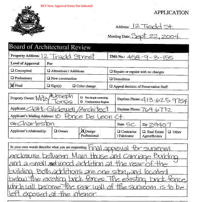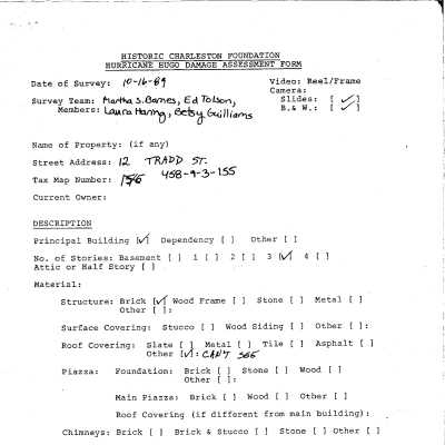 File contains historical/chain-of-title research (L. Louis Green, 1969); newspaper article (1975? DYKYC); FOHG house histories (1960s?); house history from Information for Guides of Historic Charleston (1984); BAR application and supporting architectural drawings (2004) (no indication of approval status); 1886 Earthquake Damage Assessment (pdf); Hurricane Hugo damage survey (pdf).Collection