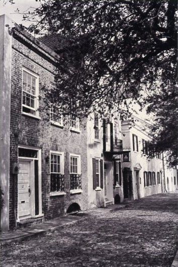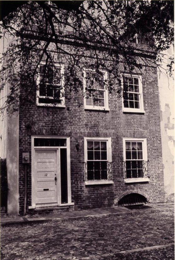 Constructed c. 1740. Gillon Street, one of Charleston's few cobblestone streets, contains several significant pre- and post-Revolutionary structures. 12 Gillon housed a tavern shortly after construction in 1740. It was occupied by the colorful merchant and politician Alexander Gillon in the 1780s. Gillon rose to great wealth within a decade of his arrival in Charleston in 1764. In the 1790s he championed anti-Federalist causes and also was largely responsible for the brief reintroduction of the African slave trade between 1803 and 1808. At the east end of the street an 1840s range of factors' offices, 9 Mid-Atlantic Wharf, survives, although it was given a colonial Revival style facade in a 1941 renovation. (Buildings of Charleston, p. 119.)Collection