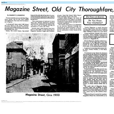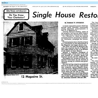 File contains newspaper article about 12 Magazine (DYKYC, 1976); newspaper about Magazine Street (DYKYC, 1976); house history from Information for Guides of Historic Charleston; house history (overview, chain-of-title, architectural description, etc.) (Butler, 2021).Collection