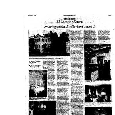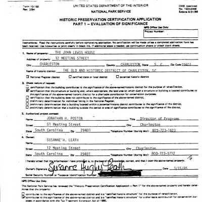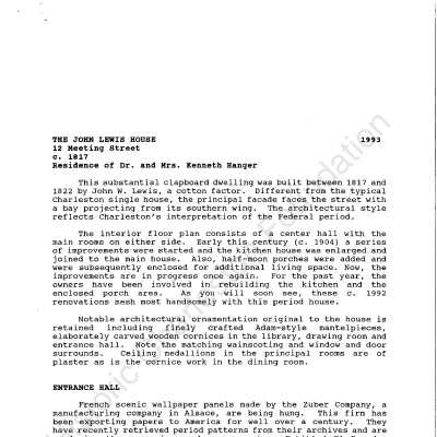 Three files contain documentation of the easement on the property including related correspondence and Confirmation of Understanding; Part I certification (National Register); correspondence regarding appraisal value; annual inspection reports, requests for alterations, and correspondence related to the management of the property; house history (unattributed, ca. 1979); FOHG house histories (1993, 2005); newspaper article (Charleston Mercury, 2010); sales brochure (date not indicated); photocopy of 1986 plat; engineer's (Russell Rosen) post-Hugo inspection letter; 1886 earthquake damage assessment (showing no damage); photocopy of floor plan (Briggs, 1995).