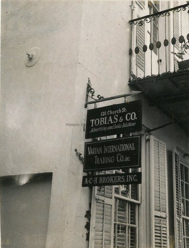 B&W photograph of the signs for the businesses occupying 121 Church Street in 1961: Tobias & Co., Varian International Trading Co., and ACH Brokers. Signs project from the edge of the front facade. Also shown are the window shutters of the first story, section of the iron balcony, and an earthquake bolt.
