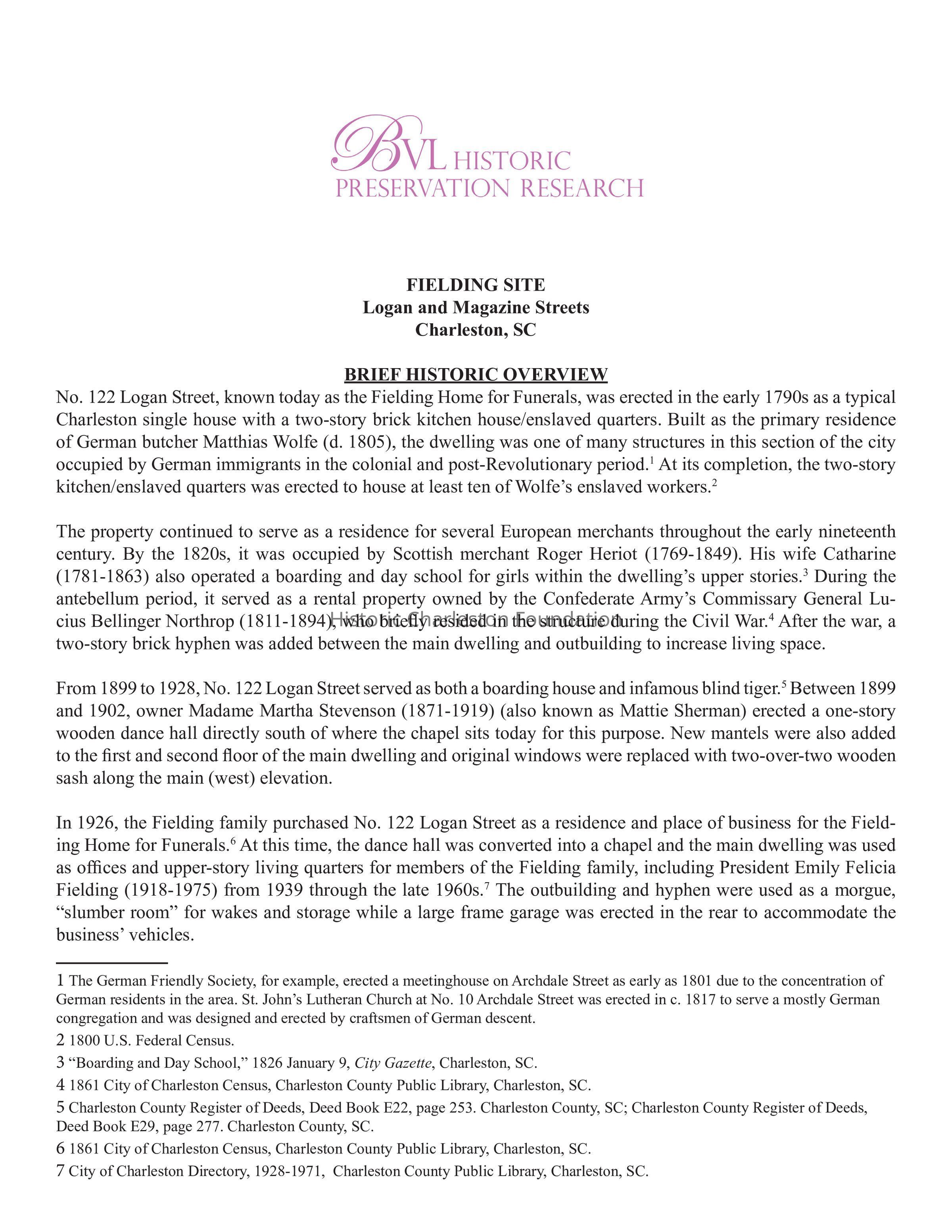 The primary purpose of this report was to document the history of the lots and structures on Logan Street site which are presently owned by Fielding Home for Funerals, and which are about to be conveyed to Charleston Day School.Context