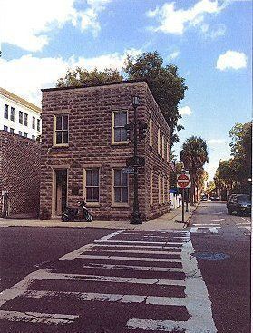 Located at the corner of Meeting Street and Queen Street, easily recognized by its unique decorative "stone" appearance reminiscent of the Richardsonian Romanesque style. Made of rusticated concrete masonry units, 2-story, flat-roofed, rectangular building.