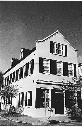 B&W photograph of 127 Church Street (Charles Mouzon House), street (front) elevation, showing the southeast corner of the building. Also shows the street corner (Church and Chalmers Streets).Collection