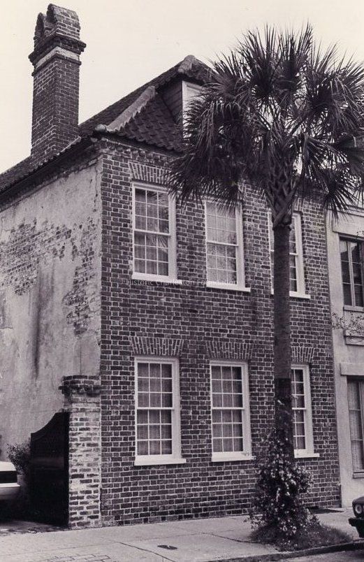 North section constructed c. 1802-15, south section c. 1820; renovated 1970s, 1990s. Constructed as two separate buildings, these were first joined together in a renovation in the 1970s. The small 2½ story house to the north, with its restored brickwork and hipped, pantile roof, was built after 1802 by shopkeeper George Keenan and sold in 1815 to Joshua Brown. To the south, the flat-roofed parapeted building was constructed by James O'Reilly after 1820. (Poston, Buildings of Charleston.)