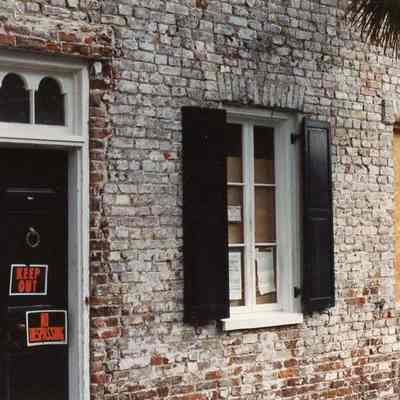 a: Front elevation showing the southwest corner of the building. Also shows the street corner (Church and Chalmers Streets). Windows are boarded, barricades are in front, and signage for contractors posted on a door.
