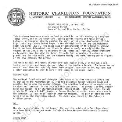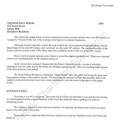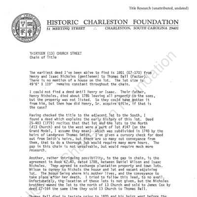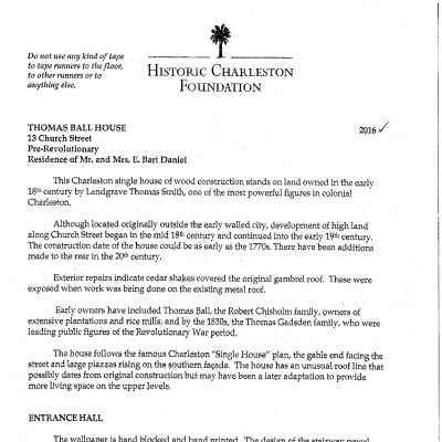 File contains FOHG house histories (undated, 2009, 2016); 20th century occupancy history from Old Codgers' Charleston Address Book; chain-of-title; photocopy of 7/31/1968 plat.Collection