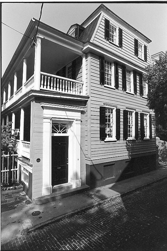Constructed before 1800; restored 1990-92. Standing on land owned in the early-18th century by Landgrave Thomas Smith, one of the most powerful figures in colonial Charleston, most of the houses in this area of Church Street were built after the Revolution. The building at 13 Church shows a rare survival of a clipped gambrel or jerkin head roof, and its interior reflects late-Georgian, post-Revolutionary details with alterations made in the early-19th century. Thomas Ball's executor's deed in 1820 describes the structure as a wooden house in need of repairs. The property was owned and rented out by Harriet Schutt, daughter of the builder of 51 East Bay Street, and her husband, Robert T. Chisolm; they conveyed the property to wealthy slave trader Thomas N. Gadsden in 1834. Gadsden lived here before moving to 116 Broad Street in the mid-1840s. (Poston, Buildings of Charleston.)