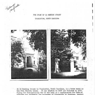 File contains FOHG house histories (ca. 1988, 1998); brief narrative history; report about 13 Meeting Street's brick; newspaper article (2/4/1962); Charleston Magazine article (1975); College of Charleston 1970 Candlelight Tour history of garden (1970).Collection