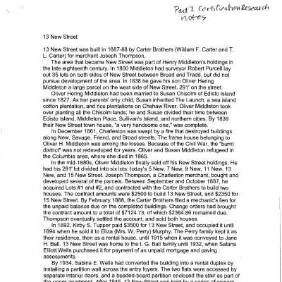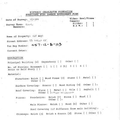Three files contain documentation of the easement on the property including mortgage subordination and correspondence; Part I certification (National Register); easement appraisal report and IRS form 8283; FOHG house history (2007); Hurricane Hugo damage survey (pdf); historical/chain-of-title research information.
