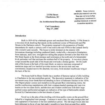 Three files contain documentation of the easement on the property including related correspondence; Part I certification (National Register);easement appraisal report and IRS form 8283; documentation related to HCF's purchase of the property; documentation related to the sale of the property, including initial sale by HCF to Stewart/Marks for restoration; FOHG house history (2008); report by Carl Lounsbury (2005) entitled "13 Pitt Street: An Architectural Description"; Rosen and Associates structural inspection report (2005); house histories from Information for Guides of Historic Charleston and The Buildings of Charleston; floor plans (reduced photocopy of PITT.013.006); proposed architectural for restoration presented to BAR (Marks, 2006) (approval status not indicated); short description of renovation project "HCF's Revolving Fund and the Henry Gerdts House, c. 1859"; copy of sales brochure describing house history and information about the restoration; Sarah Fick History Timeline - notes dated 2006.