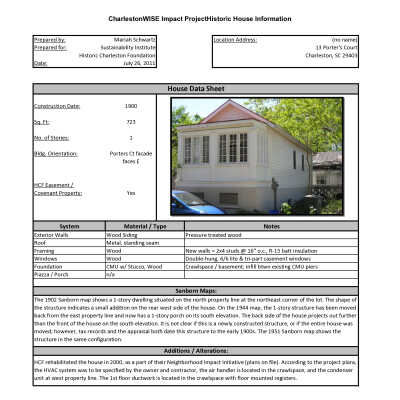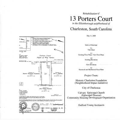 Files contain documentation of the covenant contained in title (HCF to Episcopal Diocese); sales contract (seller to HCF); chain-of-title; architectural drawings (rehabilitation) (approved with revisions); correspondence related to the sale of the property, including waiver of right of first approval; correspondence related to the rehabilitation of the house; easement appraisal; annual inspection reports, requests for alterations, and correspondence related to the management of the property; architectural drawings (Rehabilitation of 13 Porter's Court); data sheet for CharlestonWISE Impact Project (Sustainability Institute) that includes construction date, square footage, number of stories, building orientation, system materials/types, Sanborn Map research notes, and additions/alterations notes (Mariah Schwartz, 2011).