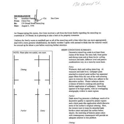 File contains memorandum about the decorative stenciling in the house; occupancy history (1900-1999) from Old Codgers' Charleston Address Book; captioned photograph (copy) from a book (Then and Now); graduate student report (Daniel Watts, 2011) on the history of the building/property, which includes historical and chain-of-title research, maps, photos, and other supporting documentation.Collection