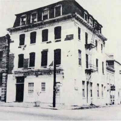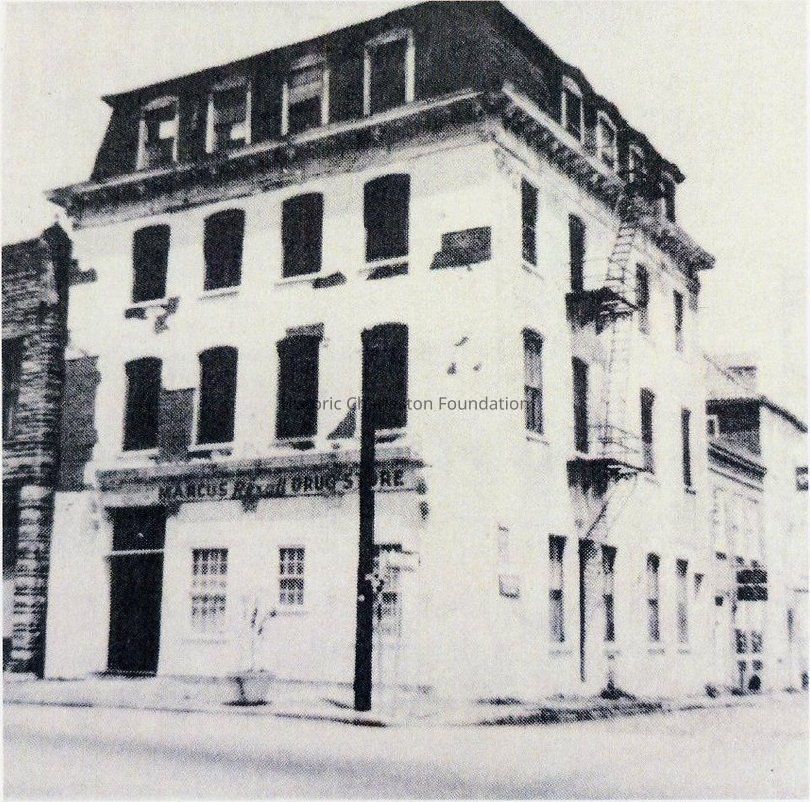 Constructed prior to 1865, a four-story building faced in brownstone with a mansard roof that was probably added at the turn of the century. Over the years, the building housed businesses including Lucas & Richardson Co. Printers, Merchants Fertilizer & Phosphate Co., and the S.C. State Employment Service, and served as apartments to provide living space for war workers in the city. Demolition began in 1970, despite the protests of preservationists, but wasn't completed until 1972 due to structural issues with a neighboring building and the resulting legal proceedings. (HCF property file.)