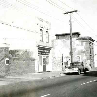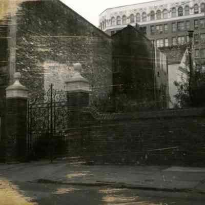 b: View of the gates to the parking lot at 131 East Bay Street. People's Building in the background.