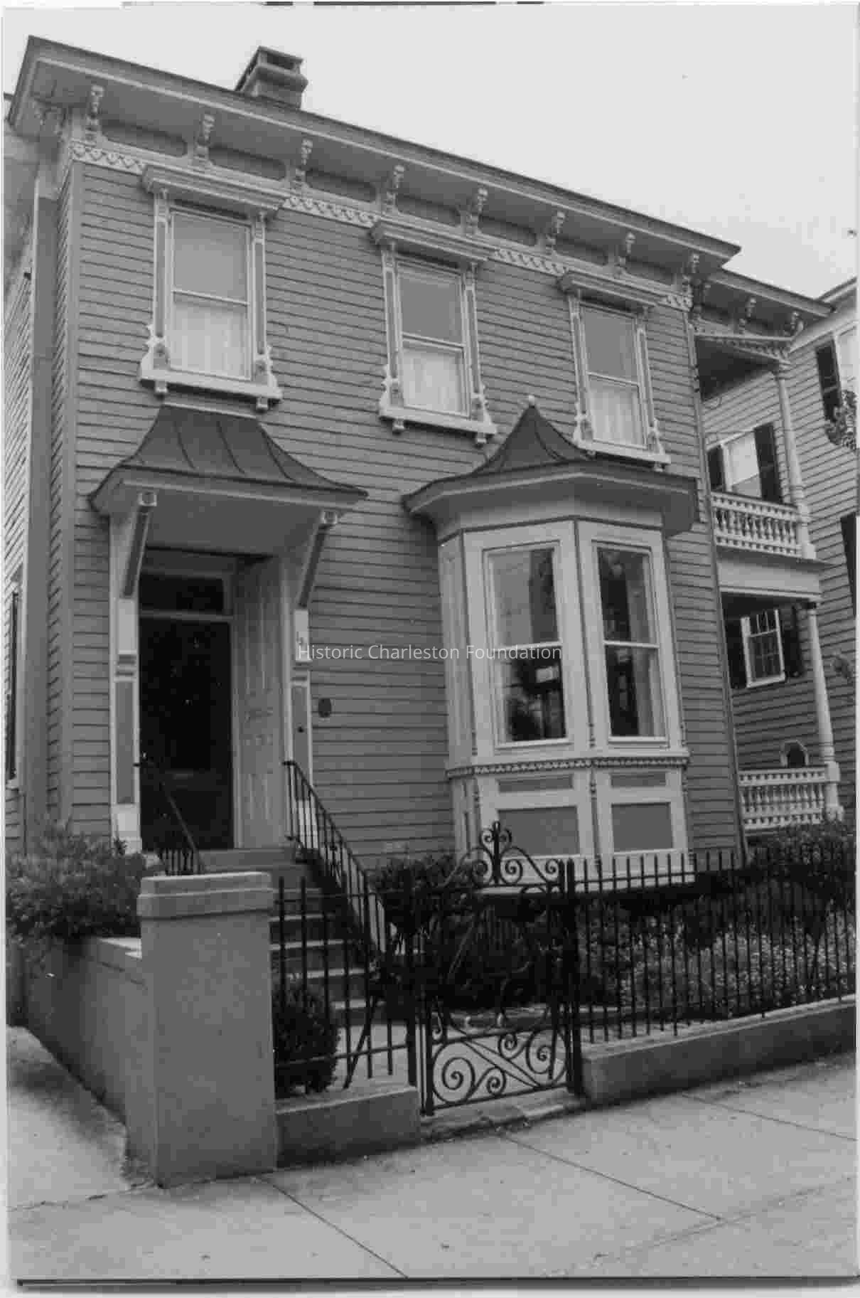 Constructed ca. 1887. One of a row of elegant Victorian single houses constructed after the fire of 1861, which destroyed earlier buildings on the block. Edward G. Voight, a shoe dealer, constructed this house, with its prominent bay window and door overhang before 1887. The original plaster cornices remain in the interior as well as the handsome walnut staircase, which has never been painted. Especially notable is the Victorian "Gingerbread" exterior trim. This house is especially interesting for the excellent condition of stencil work on the ceilings. The "ghosting" or shadowing of another pattern of stencils shows in several areas below the existing stenciling. The earlier stenciling reveals a neo-classical motif of anthemion. This is one of five known houses in Charleston to have stencil work. (Poston, Buildings of Charleston.)