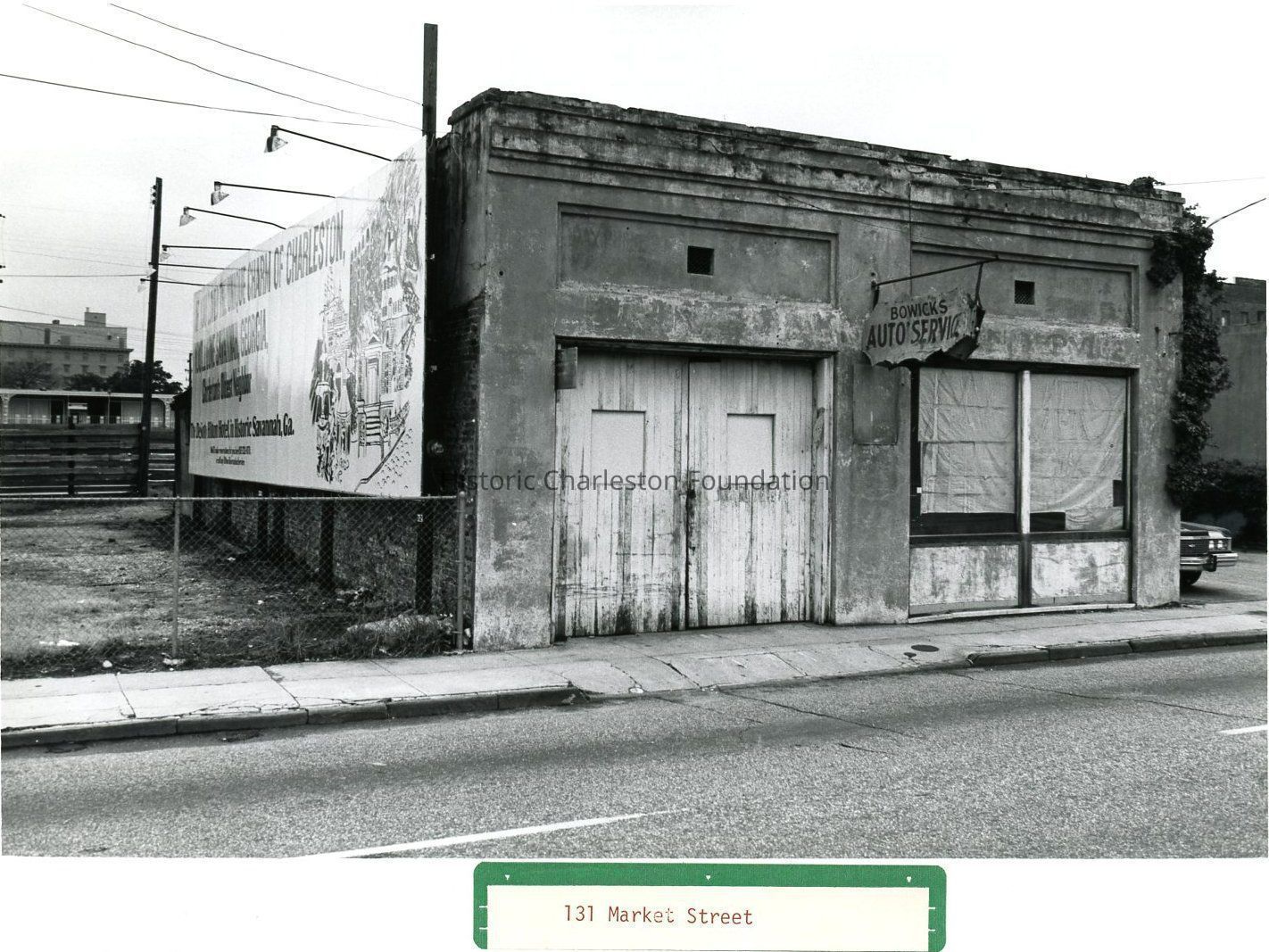 B&W photograph of 131 Market Street (Boswick's Auto Service), corner view of building (northeast elevation). Now the site of the entrance to a parking lot. Billboard for Historic Savannah posted on side of building.