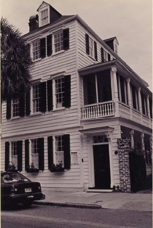 Constructed ca. 1796-1800. Although this dwelling has a plaque denoting its construction by the French Huguenot Paul Douxsaint in about 1726, that structure apparently burned in the fire of 1796. The exterior of the building, with its beaded weatherboarding, 9-over-9 windows with narrow muntins, and dormered hipped roof, follows the molding patterns of the early Federal period. Most of the interior retains late-18th century wainscoting and mantels, although several rooms have late-19th century alterations. Retaining an original, separated kitchen-laundry dependency at the rear, and brickwork on this structure with dogtooth cornicing relates to the post-Revolutionary period as well. In the 19th century Daniel Macaulay, a member of one of Charleston's leading Scottish merchant families, owned and occupied the dwelling. (Poston, Buildings of Charleston.)