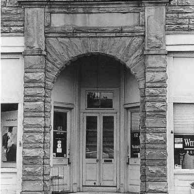 b: Doorway, showing the roughcut sandstone front facade. (Two copies of photo in sleeve.)Collection