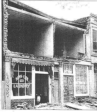 File contains photocopy of newspaper article photograph of Sing Lee Laundry taken after the 1938 tornado hit.