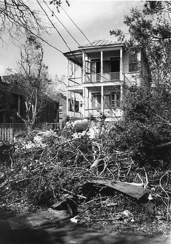 B&W photograph of the debris-covered grounds in front of 134 Queen Street after Hurricane Hugo.