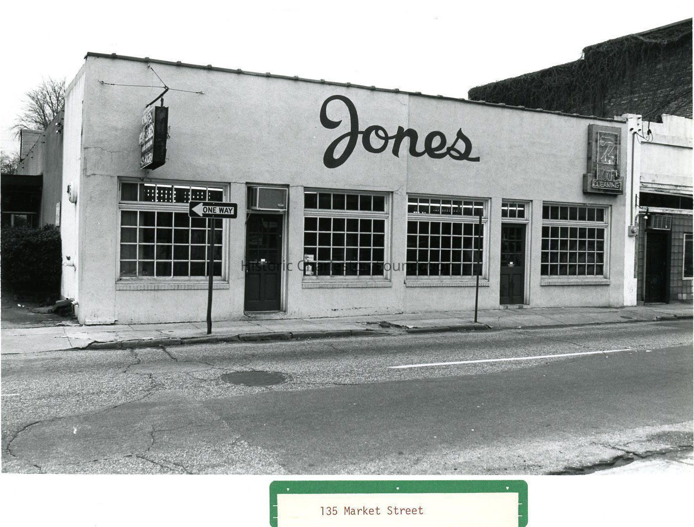 B&W photograph of 135 Market Street (Jones Dry Cleaners), street (front) elevation. Now the site of the entrance to a parking lot.