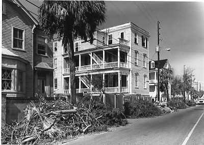 B&W photograph of the 130 block of St. Philip Street after Hurricane Hugo. Shows 136 St. Philip Street (left), 138 St. Philip Street (center), and 140 St. Philip Street (right).Collection