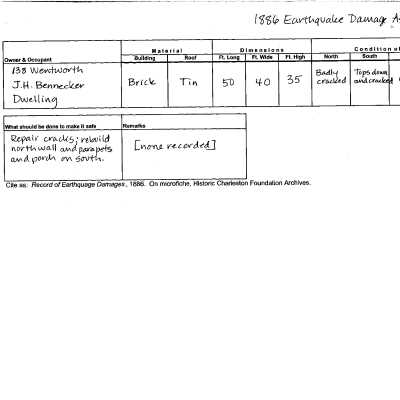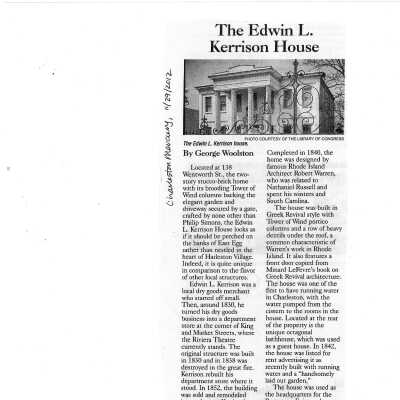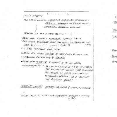 File contains newspaper articles (including 1970 and 1984 DYKYC); building history from Information for Guides of Historic Charleston (1984); building history from Tour Guide Training Manual (2011); excerpt from Architects of Charleston; draft FOHG House history (2001); house tour notes (unattributed, undated); 1886 Earthquake damage assessment; Hurricane Hugo damage survey (main house and carriage house).Collection