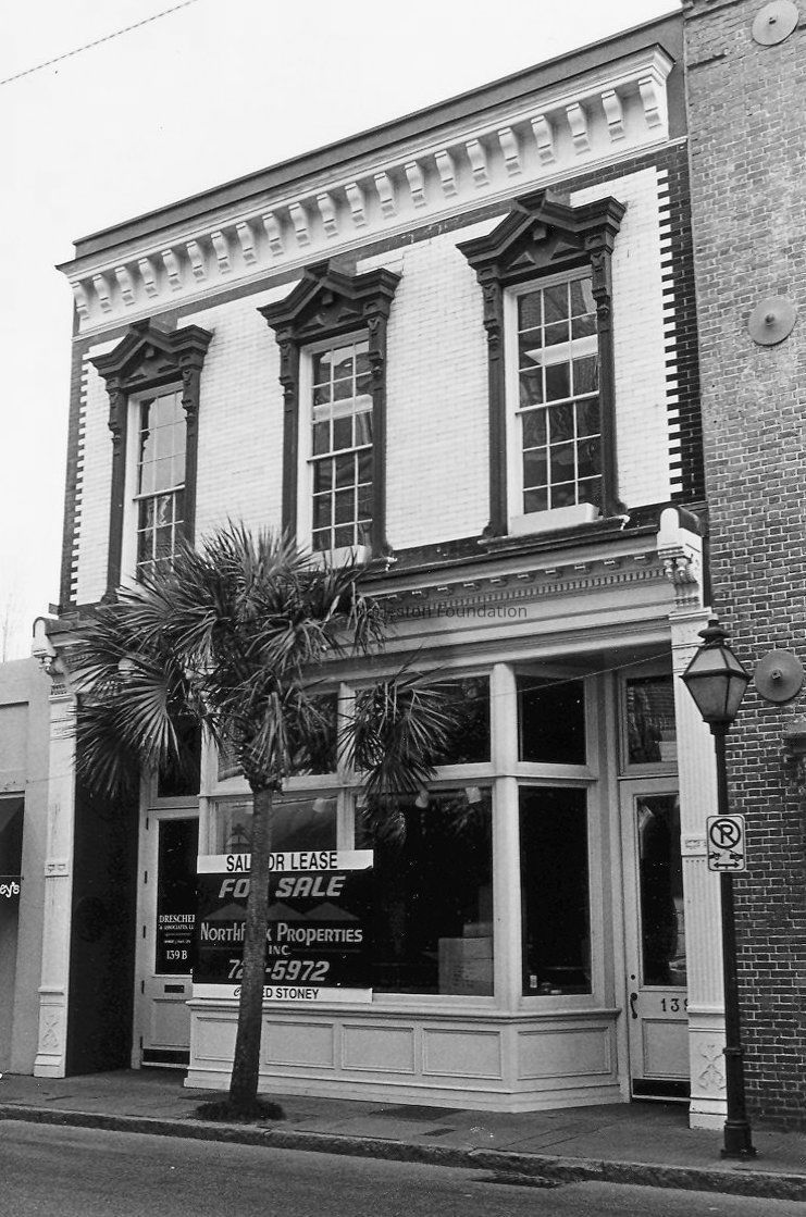 Constructed 1846; renovated 1875-90; rehabilitated 1988. Archibald and William McKinlay, prosperous free African American brothers, purchased this as well as other Market Street properties in the 1840s. Possibly of 3 stories originally, the surviving structure served its owners as a tenement until the McKinlay estate sold it in 1875 to Robert Martin, a purveyor of diverse goods, from shoes to washing machines. Martin probably renovated the facade with Italianate style window hoods, deep cornice, and new glazed face brick in white and brown. A concrete block infill was removed in recent years for restoration of the storefront. The area became the center of a rough nightlife for sailors and gamblers. In 1927, one of Charleston's leading bootleggers, Frank "Rumpty Rattles" Hogan, was shot while picking up his waitress girlfriend from her job across the street. The killers who shot from the upper windows of 139 Market Street were acquitted in a sensational trial.