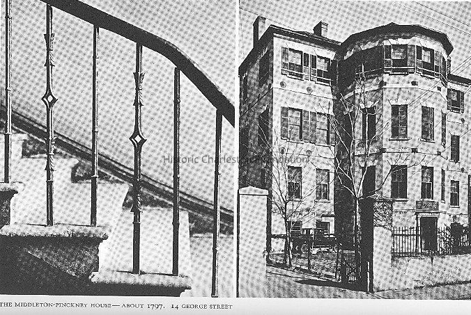 Constructed ca. 1796-99; partially renovated and rehabilitated 1880s, 1980s.This 3-storied stuccoed-brick house on a raised basement was begun about 1796 by Mrs. Frances Motte Middleton and completed by her and her second husband, Maj. Gen. Thomas Pinckney, whom she married in 1797. Edward Hooker, a Connecticut visitor, described the house in 1805: "Maj. Thomas Pinckney's house is of brick, three stories high with an elegant rotund, of the same height, in front, which served for a porch. It has an air of magnificence; but appears less advantageously from its having been left, for two or three years, in an unfinished state." General and Mrs. Pinckney sold the house to John Middleton, Mrs. Pinckney's eldest son, in 1822 for "natural love and affection" and $10,000. The polygonal front projection provides oval rooms on each floor and a more truncated rear projection contains a winding staircase. The exterior is severe save its marble belt courses, window lintels, columned entrance, and other trim. Its interior is largely original but simple with Neoclassical doors and wainscoting and some later Regency style mantelpieces and cornices. The building has had little alteration despite its occupancy for more than 100 years by the Charleston Commissioners of Public Works, who constructed a reservoir, water tower, and pumping station at the rear of the site, using the main house as offices. The reservoir later became a public swimming pool until closure in the 1960s. In the 1980s 14 George Street became the headquarters for the Spoleto Festival and it is also the main office for the Charleston Symphony Orchestra. The rear lot and additional parcels have been subdivided and developed as a new street in Ansonborough called Menotti Street. (Poston, Buildings of Charleston.)