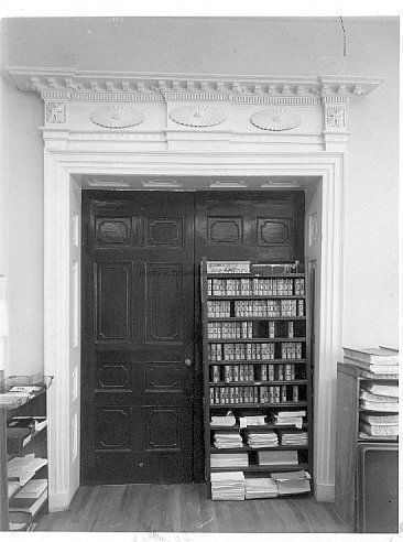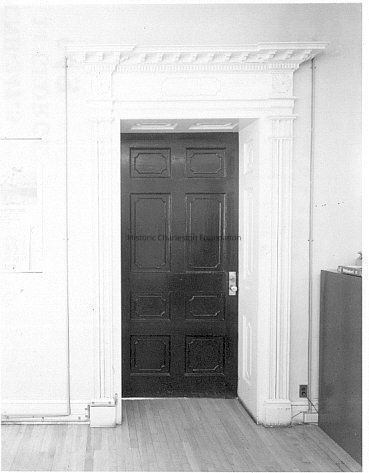 3) 1st floor, double doors from former hall to stair hall (original transom gone; jambs have slight curve in plan in addition to being on line with center of stair hall; stair soffit new) [pictured here]
