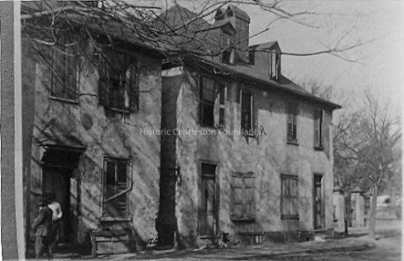B&W photographic reprint of the Alexander Peronneau Tenements (141 Church and 143-145 Church Street), front (east) elevation, before the 1920s restoration. Two African American men stand in front of the doorway to 141 Church Street.