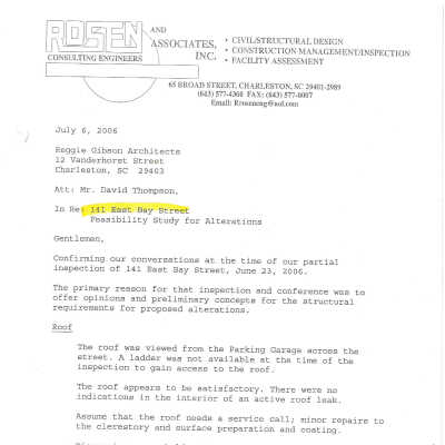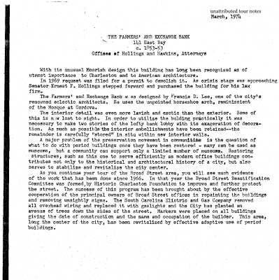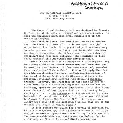 File contains building history from Information for Guides of Historic Charleston; building history from Architectural Guide to Charleston (by Simons & Thomas; tour notes (unattribued, 1974); National Register Nomination form; photocopies of photos; chapter on Francis D. Lee from Architects of Charleston; excerpt from Charleston Antebellum Architecture and Civic Destiny; 20th century occupancy from The Old Codgers' Charleston Address Book; Rosen and Associates inspection reports (2001, 2006).Collection