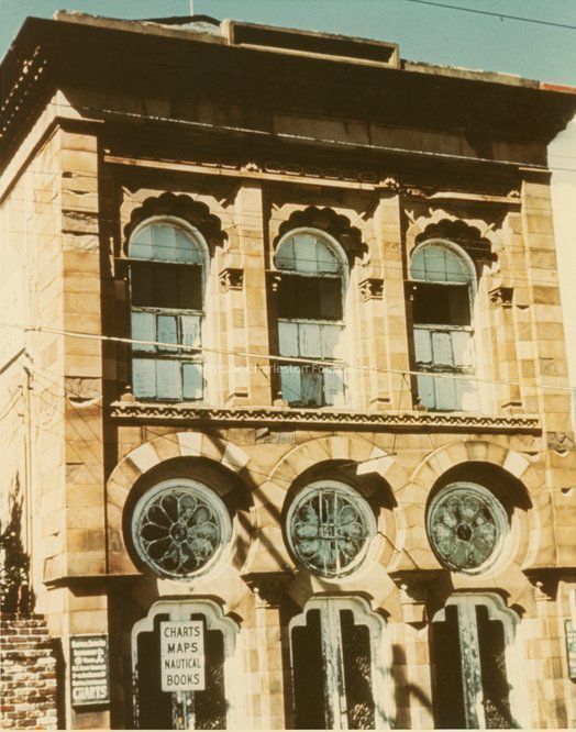 Color photograph of 141 East Bay Street (Farmers and Exchange Bank), front (east) elevation. Signage for "Charts, Maps, Nautical Books" in front of building.