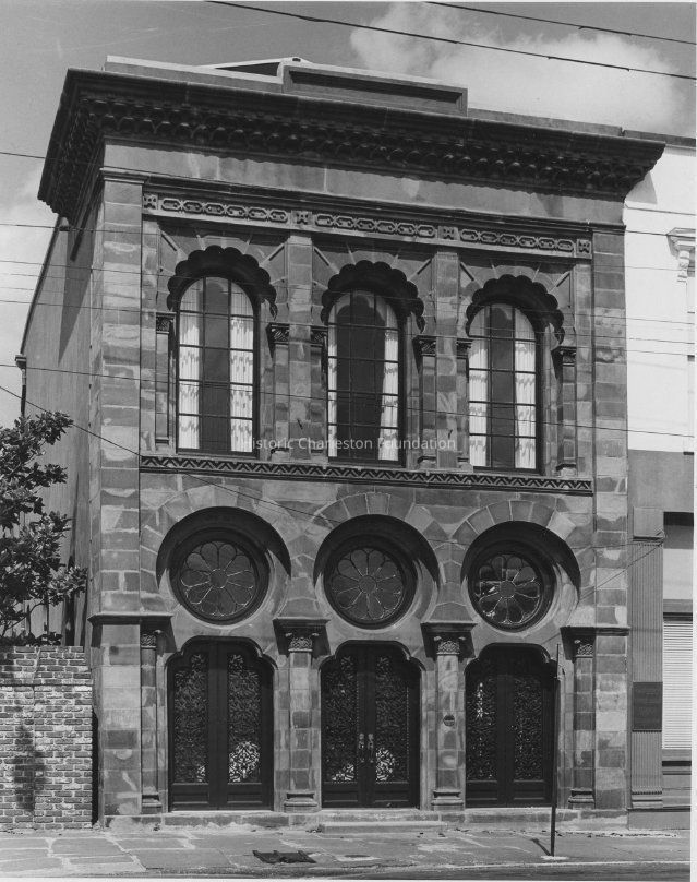 B&W photograph of 141 East Bay Street (Farmers and Exchange Bank), front (east) elevation, likely taken after restoration. Labeled on back of photo: "Formerly the Farmer's and Merchants Exchange Bank, c. 1853. A prime example of adaptive use, this is now law offices for Hollings & Hawkins, attorneys."Collection